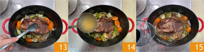 Remettez la viande dans la casserole 13, ajoutez 500 g de bouillon de chapon 14 et le vin rouge 15.