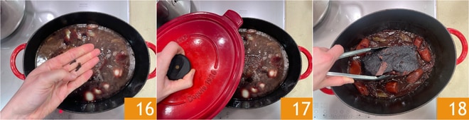 Ajoutez les clous de girofle 16, couvrez avec un couvercle 17 et faites cuire à feu moyen-doux pendant 4-5 heures, en prenant soin de retourner la viande de temps en temps 18 pour qu'elle reste bien immergée. À la fin, vous devez obtenir un fond de cuisson réduit, très dense. Si ce n'est pas le cas, faites chauffer à feu vif pendant quelques minutes sans couvercle.