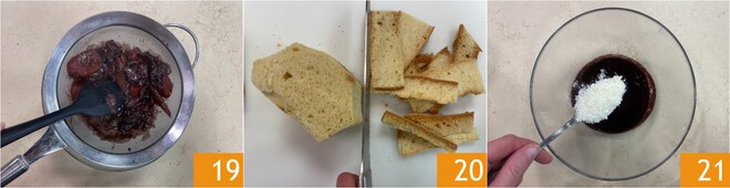 Retirez la viande, qui ne sera pas utilisée pour les anolini : cela fera un excellent second plat accompagné simplement d'une salade ou de légumes grillés. Filtrez le reste à travers une passoire dans un bol 19, vous devriez en obtenir environ 200 g. Prélevez la mie du pain 20. Ajoutez le parmesan au fond de cuisson 21.