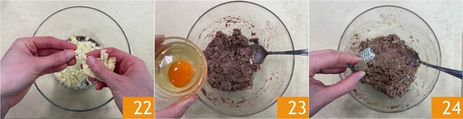 Ajoutez également la mie 22 et mélangez pour homogénéiser le tout. Ajoutez ensuite l'œuf 23 et la noix de muscade 24.