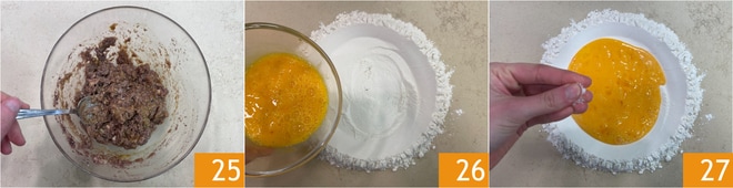 Mélangez pour obtenir un mélange homogène 25 et réservez. Pour préparer la pâte fraîche, disposez la farine en fontaine et versez-y les œufs battus 26. Ajoutez une pincée de sel 27.