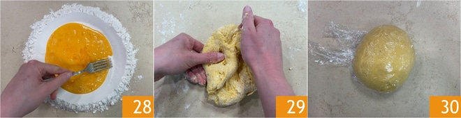 Incorporez la farine petit à petit à l'aide d'une fourchette 28 puis pétrissez à la main 29 jusqu'à obtenir une pâte lisse et homogène. Couvrez-la de film plastique et laissez reposer au réfrigérateur pendant 20 minutes 30.