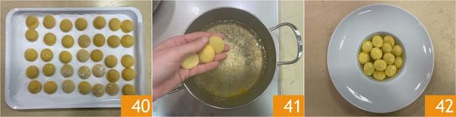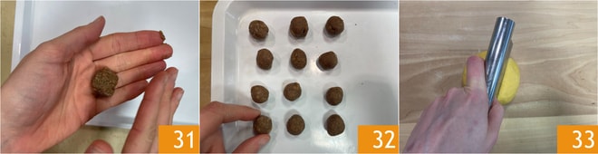 Entre-temps, prélevez 7 g de farce à la fois et formez des petites boules 31 que vous placez sur un plateau au fur et à mesure 32. Reprenez la pâte, divisez-la en deux 33.