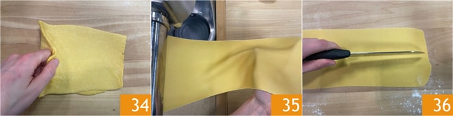 Aplatissez chaque morceau et pliez la pâte pour la passer dans le laminoir 34. Continuez de passer la pâte dans la machine en diminuant l'épaisseur à chaque passage, jusqu'à obtenir deux feuilles de 2 mm d'épaisseur 35. Coupez-les en deux 36.
