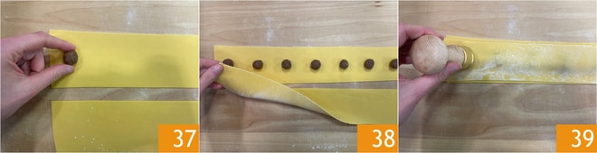 Placez les boules de farce sur une moitié, à environ 3 cm de distance 37, refermez avec l'autre moitié 38 et découpez les anolini à l'aide de l'emporte-pièce approprié 39 ou d'un emporte-pièce rond de 3,5 cm de diamètre.
