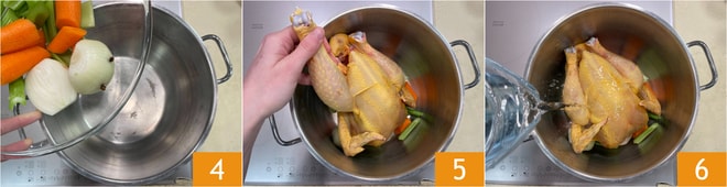 Mettez les légumes 4 et le chapon 5 dans une casserole. Couvrez d'eau 6 et faites cuire à feu doux, avec un léger frémissement, pendant au moins 1 heure.