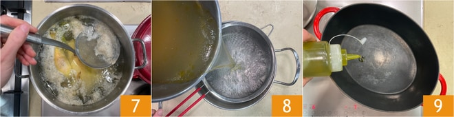 De temps en temps, écumez 7 la mousse qui se forme à la surface pour garder le bouillon le plus propre possible. Retirez la viande et les légumes, filtrez le bouillon dans une autre casserole et gardez-le chaud 8. Dans une cocotte en fonte, versez l'huile 9.