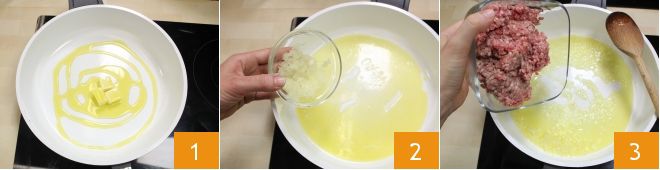 Pour réaliser les arancinis de spaghetti, commencez par préparer le ragoût de viande : dans une poêle antiadhésive, faites fondre, à feu doux, le beurre avec un peu d'huile 1, puis ajoutez l'oignon finement haché 2 et faites-le revenir quelques minutes. Lorsque l'oignon est fané, ajoutez la viande hachée et faites-la revenir à feu vif pendant 5 minutes 3;