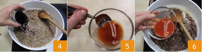 Puis ajoutez le vin et laissez évaporer 4. Diluez la purée de tomates dans un peu d'eau 5 et ajoutez-la à la viande 6, mélangez bien, ajustez le sel et le poivre et continuez la cuisson pendant 20 minutes à feu modéré.