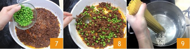 Lorsque la viande est presque cuite et que la sauce s'est épaissie, ajoutez les petits pois surgelés 7 et terminez la cuisson en remuant souvent pour éviter que les ingrédients ne collent au fond de la casserole 8. Une fois prêt, laissez refroidir le ragoût de viande et de petits pois et mettez-le dans un bol couvert de film plastique, puis placez-le au réfrigérateur. Portez à ébullition une grande quantité d'eau salée et faites cuire les spaghettis 9.