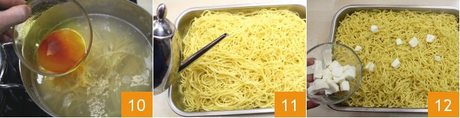 Pendant ce temps, dissolvez le safran en poudre dans un peu d'eau de cuisson et ajoutez-le aux pâtes 10. Lorsque les spaghettis sont cuits (nous conseillons de ne pas les égoutter al dente), égouttez-les et mettez-les dans un plat avec de l'huile pour éviter qu'ils ne collent 11. Laissez-les refroidir complètement, puis assaisonnez-les avec du beurre 12;