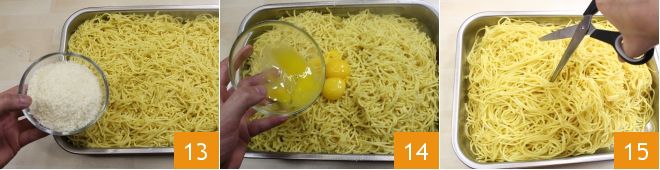 Et du parmesan râpé 13, ajustez le sel et ajoutez les jaunes d'œufs 14. Mélangez bien tous les ingrédients et commencez à couper grossièrement les pâtes, en vous aidant de ciseaux de cuisine 15.