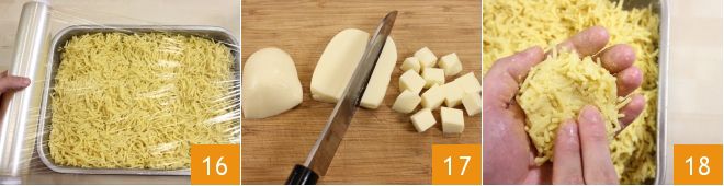 Couvrez maintenant le plat de film plastique et placez-le au réfrigérateur pour une nuit 16. Une fois le temps écoulé, sortez les pâtes et le ragoût du réfrigérateur, puis coupez la scamorza en dés 17. Commencez à composer les arancinis en prenant un peu de spaghettis et en formant une boule, avec deux doigts créez un trou au centre 18;
