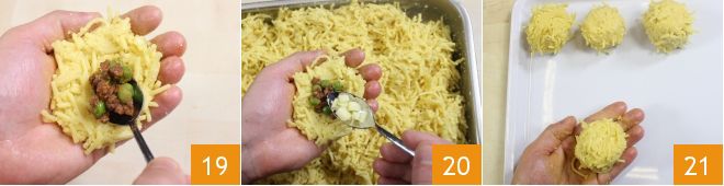 Et ajoutez une cuillère à café de ragoût 19 et quelques morceaux de fromage 20. Toujours en vous aidant de la pression des mains, refermez l'arancini et placez-le sur un plateau. Procédez de la même manière jusqu'à former tous les arancinis.
