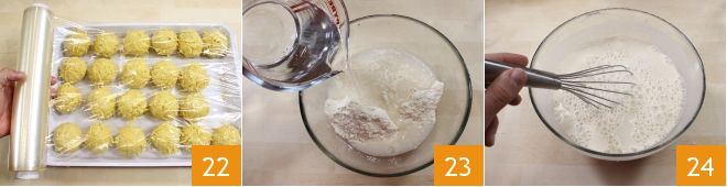 Couvrez le tout de film plastique et mettez au réfrigérateur pendant une dizaine de minutes. Pendant ce temps, préparez la pâte à frire en mettant dans un bol de la farine, de l'eau et une pincée de sel 23. Avec un fouet, mélangez tous les ingrédients jusqu'à obtenir un mélange liquide et sans grumeaux 24.