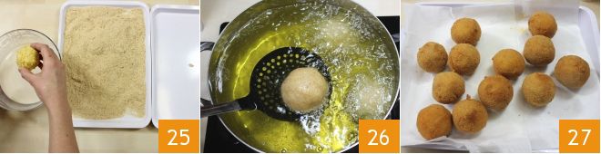 Faites chauffer l'huile pour la friture et commencez à passer, un par un, les arancinis d'abord dans la pâte à frire puis dans la chapelure 25. Lorsque l'huile est bien chaude, commencez à les frire pendant 5-6 minutes maximum 26, ou jusqu'à ce que la panure soit dorée (pour vérifier que l'huile est à température, faites le test du bâtonnet : plongez la pointe d'un bâtonnet en bois dans l'huile, si vous voyez qu'elle commence à frire alors elle sera suffisamment chaude). Laissez égoutter les arancinis sur un plateau recouvert de papier absorbant afin qu'ils perdent tout excès d'huile 27. Ainsi, vos arancinis de spaghetti seront prêts à être dégustés!