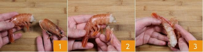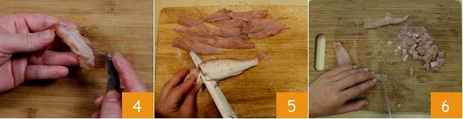 Retirez l'intestin des crevettes avec une pince 4, le filet noir central. Ensuite, nettoyez aussi les langoustines, en détachant la tête et en coupant avec des ciseaux la carapace pour prélever la chair ; retirez aussi l'intestin et hachez les crevettes ainsi que les langoustines. Enfin, prenez les rougets déjà nettoyés (sinon ouvrez-les pour retirer les viscères), incisez les rougets dans la partie supérieure en insérant la lame du couteau près de la tête et filetez-les 5, en veillant à ôter les arêtes des filets avec des pincettes. Ensuite, émincez les filets obtenus 6.