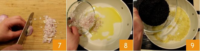 Gardez les préparations de poisson de côté et occupez-vous de la cuisson du riz venere : hachez l'échalote 7 et versez-la dans une grande poêle avec un filet d'huile 8. Faites revenir à feu doux en évitant de brûler l'échalote, puis ajoutez le riz venere 9.