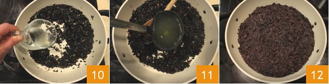 Faites griller le riz, puis après 5 minutes versez le vin blanc 10 et au fur et à mesure le fumet de poisson 11 pour favoriser la cuisson du riz venere (la cuisson de cette qualité de riz est très longue, vous pouvez réduire les temps en utilisant une cocotte-minute ou en achetant du riz venere précuit). Vers la fin de la cuisson, ajoutez un peu d'amidon de riz qui rendra les arancini plus compacts lorsque vous les formerez. Terminez la cuisson et éteignez le feu 12.