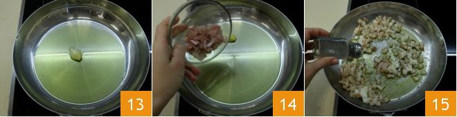 Pendant que le riz venere cuit, dans une autre poêle versez abondamment d'huile et faites dorer une gousse d'ail 13. Puis versez le poisson haché précédemment 14, salez et poivrez à votre goût 15 et laissez cuire pendant 2 minutes.