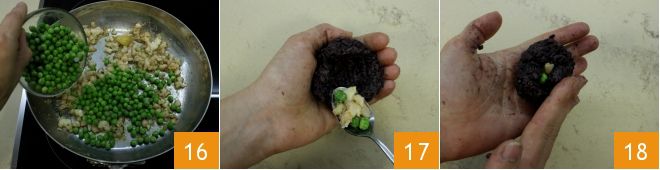 Ajoutez les petits pois 16 et faites cuire quelques minutes (si vous utilisez des petits pois congelés, vous pouvez les blanchir quelques minutes auparavant dans de l'eau bouillante) ; puis retirez l'ail et éteignez le feu. Laissez refroidir les préparations et une fois refroidies, vous pouvez former les arancini : mouillez vos mains avec un peu d'huile, puis aplatissez un peu de riz dans la paume de votre main et créez une cavité au centre. Versez la farce à l'intérieur du riz 17 et refermez 18 en formant une boule. Pour donner la forme classique de l'arancino, formez la boule puis serrez une partie pour former une pointe.