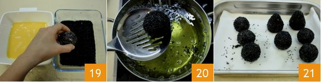 Dans un bol, battez les œufs et préparez les graines de sésame noir ; puis passez les arancini d'abord dans l'œuf battu puis dans le sésame noir 19 en recouvrant soigneusement toute la surface. Faites frire un ou deux arancini à la fois dans une abondante huile de graines (ne doit pas dépasser la température de 170°C) 20, puis déposez-les sur un plateau recouvert de papier absorbant 21. Servez vos arancini chauds ou tièdes !