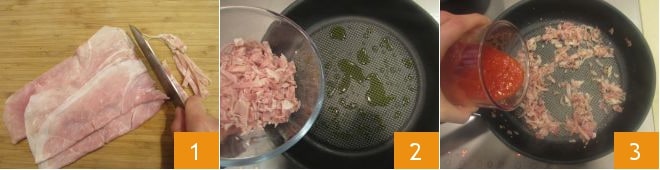 Pour préparer l'arbre de pâte, mettez à bouillir une grande casserole d'eau pour la pâte, salez et portez à ébullition. Ensuite, faites bouillir de l'eau dans une petite casserole (elle vous servira pour blanchir quelques instants les petits pois pour la décoration). Prenez les tranches de jambon et coupez-en 100 g d'abord en lanières 1; puis hachez-le grossièrement au couteau. Dans une grande casserole, chauffez un filet d'huile et faites dorer brièvement le jambon cuit 2. Après quelques instants, ajoutez la purée de tomates 3.