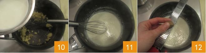 Une fois le roux réalisé, versez le lait chaud 10 et continuez de mélanger avec le fouet jusqu'à ce que la sauce s'épaississe 11. La consistance doit être assez fluide et la béchamel ne doit pas être trop compacte. Assaisonnez la béchamel avec du sel et en râpant de la noix de muscade 12.