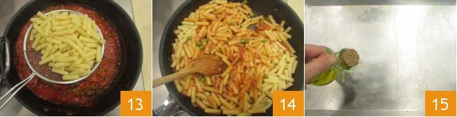Faites cuire les pâtes pendant le temps indiqué sur l'emballage et égouttez-les directement dans la poêle où vous avez cuit la sauce 13. Mélangez soigneusement 14 ; badigeonnez le fond d'un plat à four aux bords bas de dimensions 38x25 cm avec de l'huile 15,