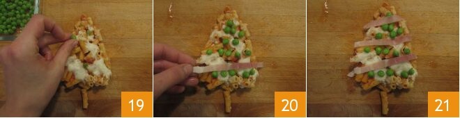 Une fois le temps écoulé, sortez du four et laissez tiédir les pâtes : puis commencez à découper des carrés, coupez chacun en deux pour obtenir deux triangles, qui seront vos petits arbres. Décorez vos petits arbres avec les petits pois que vous avez mis de côté 19, placez-les comme s'ils étaient les boules de l'arbre. Coupez 50 g du jambon mis de côté en lanières et placez-en 2-3 sur le petit arbre comme des guirlandes décoratives 20. Servez vos petits arbres de pâte 24 !