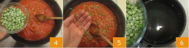 Ajoutez aussi 60 g de petits pois 4. Salez et aromatisez avec le thym effeuillé ; faites cuire la sauce pendant environ 5 minutes 5. Dans une autre petite casserole, blanchissez les 20 g restants de petits pois quelques instants, puis égouttez-les et réservez 6.