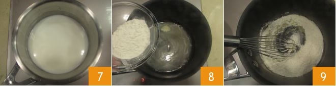 Passons maintenant à la Béchamel : chauffez le lait dans une petite casserole 7, dès qu'il frôle l'ébullition, éteignez et gardez au chaud. Dans une autre petite casserole, faites fondre le beurre à feu très doux, lorsqu'il est complètement fondu, ajoutez la farine 8 et mélangez aussitôt avec un fouet pour éviter la formation de grumeaux 9.