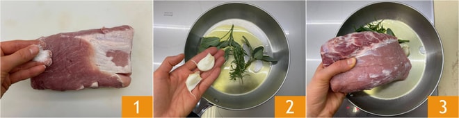 Pour préparer le rôti de porc à la sauce au thon, commencez par saler le rôti sur tous les côtés 1. Dans une poêle, mettez l'huile, ajoutez la sauge, le romarin et l'ail en chemise 2. Une fois l'huile chaude, placez la viande dans la poêle 3.