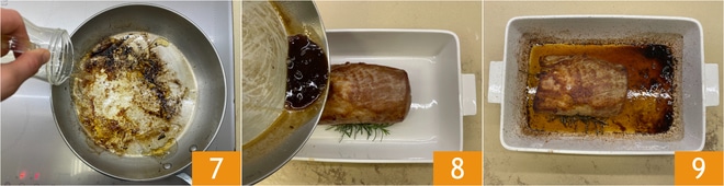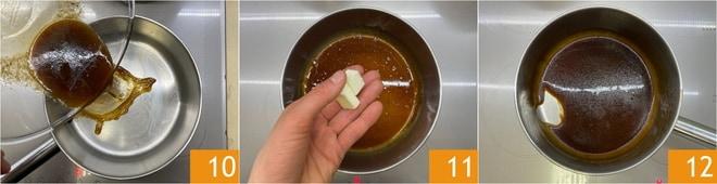 Déglacez le plat avec de l'eau pour récupérer le jus de cuisson et transférez-le dans une petite casserole 10. Si nécessaire, réduisez un peu et ajoutez le beurre 11, faites-le fondre pour obtenir une sauce fluide 12; réservez.