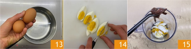 Faites bouillir les œufs 13 et une fois prêts, coupez-les en quartiers 14. Dans un récipient haut, placez les œufs, ajoutez les filets d'anchois 15.