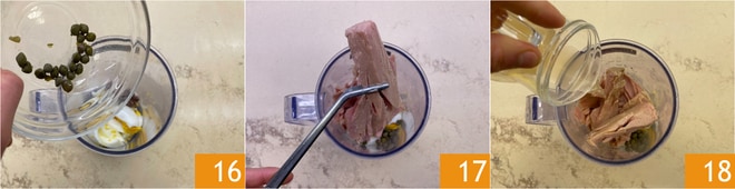 Ajoutez les câpres 16, le thon 17 et le bouillon de viande 18.