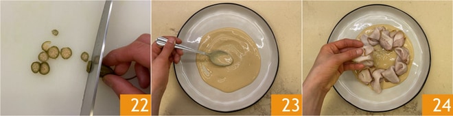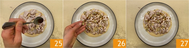 Coupez les câpres en rondelles 22. Dressez le plat en mettant de la sauce au thon au fond 23, puis disposez le rôti tranché en chevauchant légèrement les tranches 24.