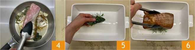 Faites dorer tous les côtés jusqu'à ce qu'ils soient bien dorés 4. Dans un plat à four, mettez la sauge, le romarin 5, et le rôti 6.