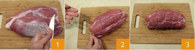 Pour réaliser le rôti au lait, commencez par ficeler la viande en suivant les instructions que vous trouverez dans la fiche de l'école de cuisine Comment ficeler le rôti. Placez la viande sur une planche à découper, dans notre cas le gîte de veau, et éliminez le cartilage et l'excès de graisse qui pourraient sinon durcir pendant la cuisson 1. Ensuite, avec la ficelle de cuisine, réalisez la cage (2-3).