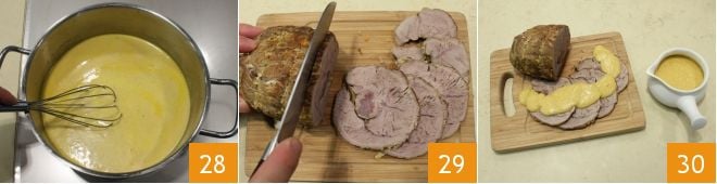 mélangez avec un fouet 28 et faites cuire à feu doux pour épaissir la sauce. Quand la sauce est crémeuse, éteignez le feu et transférez-la dans une saucière. Prenez le rôti au lait, coupez-le en tranches 29 et servez-le accompagné de la sauce chaude 30.