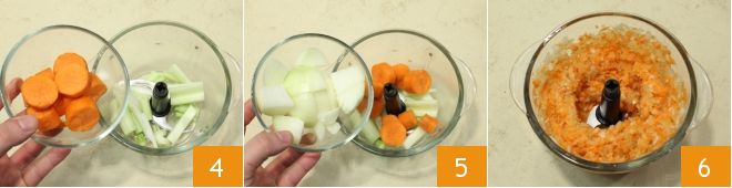 Hachez les légumes pour le soffritto : mettez dans le mixeur le céleri, la carotte 4, l'oignon 5, actionnez le mixeur pour les hacher finement 6 et mettez de côté le mélange de légumes pour le soffritto.