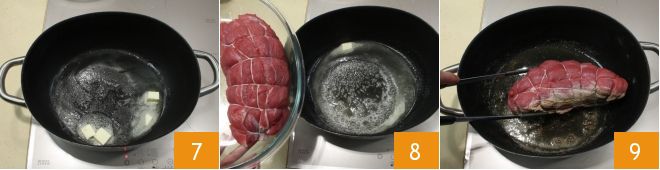 Maintenant, placez une grande casserole sur le feu, faites fondre 30 g de beurre 7, mettez le rôti 8 et faites dorer la viande de tous les côtés 9.