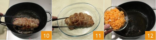 Quand la viande est bien dorée 10, retirez-la de la casserole et placez-la dans un plat 11. Dans la même casserole, faites fondre le reste du beurre et faites-y revenir l'oignon, le céleri et la carotte hachés finement avec le mixeur 12;