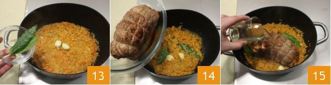 ajoutez ensuite 2 gousses d'ail et les feuilles de laurier 13. Quand le soffritto est bien réduit, ajoutez le rôti de veau 14, déglacez ensuite avec le demi-verre de vin 15, une fois évaporé, salez et poivrez.