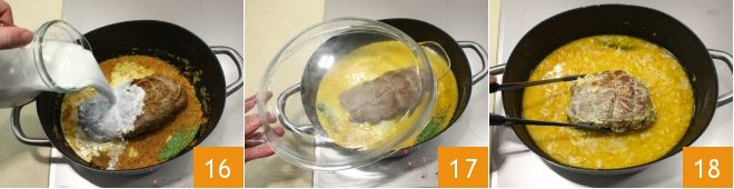 À ce stade, ajoutez le lait déjà chaud 16, poursuivez la cuisson avec le couvercle 17, jusqu'à ce que la viande soit bien cuite à l'intérieur, pendant environ 50 minutes. Une fois la cuisson terminée, retirez la viande 18.