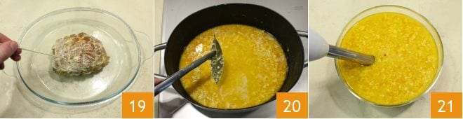 Pour vérifier la cuisson, piquez la viande avec un cure-dent 19, si elle perd un liquide transparent, cela signifie que la viande est cuite à point, si un liquide rose s'écoule, poursuivez la cuisson. Si aucun liquide ne s'échappe, cela signifie que la viande a été cuite trop longtemps. Maintenant, éliminez du fond de cuisson les feuilles de laurier 20 et les gousses d'ail, placez le fond dans un bol et passez-le avec un mixeur plongeant 21