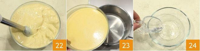 jusqu'à obtenir une sauce crémeuse 22. Placez la sauce obtenue dans une casserole 23, pendant ce temps, dans un petit bol, mettez quelques cuillères d'eau froide 24