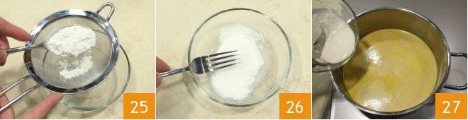 ajoutez une cuillère de farine tamisée 25 et mélangez pour dissoudre la farine 26, cela évitera la formation de grumeaux dans la sauce. Ajoutez ensuite la farine à la sauce 27,