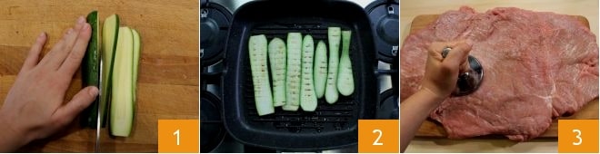 Pour préparer le roulé avec jambon cru, fontina et courgettes grillées, préparez le bouillon de légumes qui vous servira à cuire la viande ; ensuite, lavez et équeutez les courgettes, puis coupez-les en tranches régulières d'environ un demi-centimètre d'épaisseur 1 et faites-les griller sur une grille en fonte brûlante 2, des deux côtés. Ensuite, battez la viande de veau pour la rendre plus tendre et fine 3.