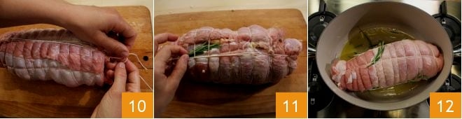 Enfin, fixez le tout avec un nœud à l'extrémité de la viande et attachez la ficelle à l'autre extrémité 10. Aromatisez avec une branche de romarin 11. Ensuite, préparez le condiment du roulé : coupez grossièrement la carotte, le céleri et l'oignon pelé. Dans une cocotte ovale, versez l'huile, faites-la chauffer, puis placez le roulé 12 et faites-le dorer en le retournant de temps en temps pour une dorure uniforme.